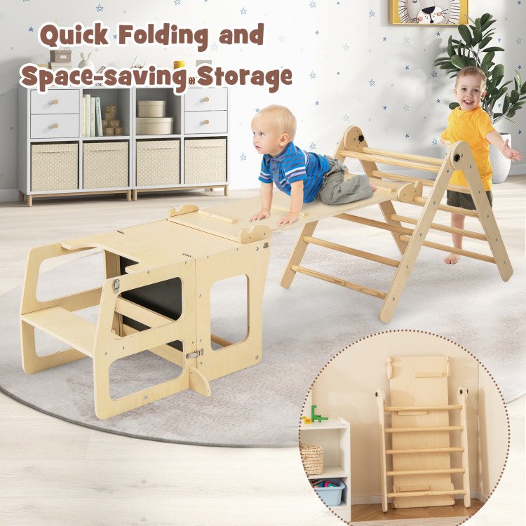 1.7-In-1 Fun Climbing Set: This climbing set is designed with a sliding ramp, a climbing ramp, a climbing ladder, a crawling tunnel, a step stool, a kids table and chair set and Chalkboard. It will entertain kids all the time. Solid wood bars and climbing rocks ensure easy climbing. Your little one can use it to crawl, climb or slide, which benefits kids’ motor skills. Applicable age: 3-14 years old. Weight capacity of each part: 135 LBS/60 KG